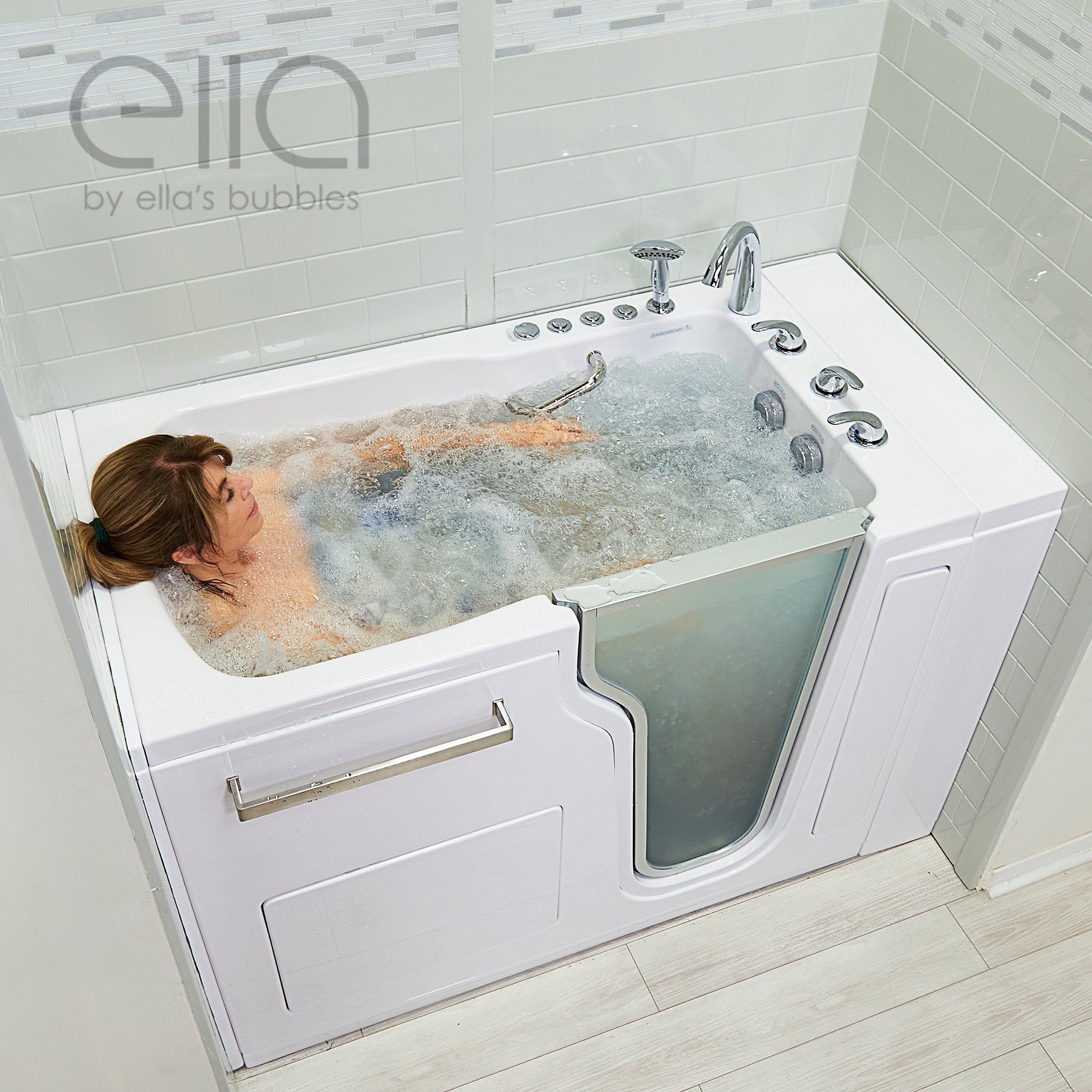 Ella’s Bubbles larger model, the Royal, is 2 inches wider than the Elite and features a 24-inch wide seat to accommodate larger body types or those who prefer a more spacious bathtub interior. The Royal boasts a custom-made, beautifully designed brushed stainless steel inward swing door with frosted tempered glass, paired with a white glossy acrylic shell, giving this walk-in tub a sleek and contemporary look. The Royal comes equipped with Ella fast-fill faucet and proprietary dual drain technology, ensuring the industry’s fastest gravity-driven drainage.