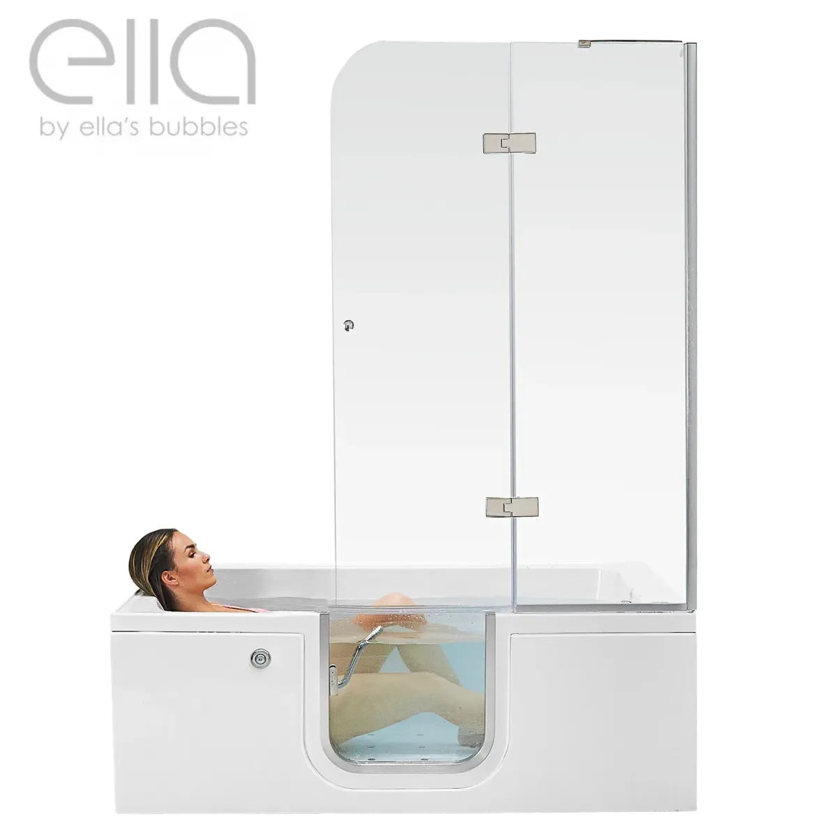 Experience ultimate relaxation and convenience with the Ella Laydown60 acrylic walk-in bathtub, uniquely designed to fit standard 60-inch alcove openings. The Laydown60 is perfect for safe step-in bathtub bathing and showering, optimizing space in standard bathrooms. Its centered inward swing tempered glass door, low step-in threshold, and textured floor significantly reduce the risk of tripping and slipping during showering, or when entering or exiting the tub. Additionally, its unique vertical bath wall design provides wider interior floor space compared to the standard curvature of conventional bathtubs.